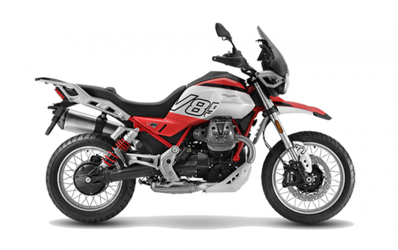 Le cadre peint en rouge et la livrée bicolore Rosso Fuji et Grigio Tambori confèrent à la V85TT un style authentique et distinctif. Des détails comme le ressort de l'amortisseur arrière rouge et réglable en précharge ajoutent une touche de personnalité à cette moto tout-terrain emblématique.